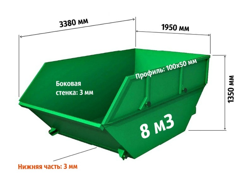 Бункеры-накопители (типа "лодочка") на 8 куб. метров предназначены для бытовых (коммунальных) отходов, изготавливаются из высокопрочного стального листа марки СТ-3. Габаритные размеры: 3380 х 1900 х 1350 мм. По периметру бункера устанавливаются элементы жесткости из профиля 60 х 30 мм. Данный контейнер для ТБО имеет специальные устройства захвата, предназначенные для погрузки и разгрузки специальным транспортом, например бункеровозом лифтдампером. В зависимости от толщины металла (1.5-4 мм) и усилений выдерживает нагрузку от 1650 до 3000 кг. Бункер транспортируется и поставляется без упаковки. При транспортировке допускается нарушение до 5% площади лакокрасочного покрытия. Допускается штабелирование (один в один) не более 3 штук.